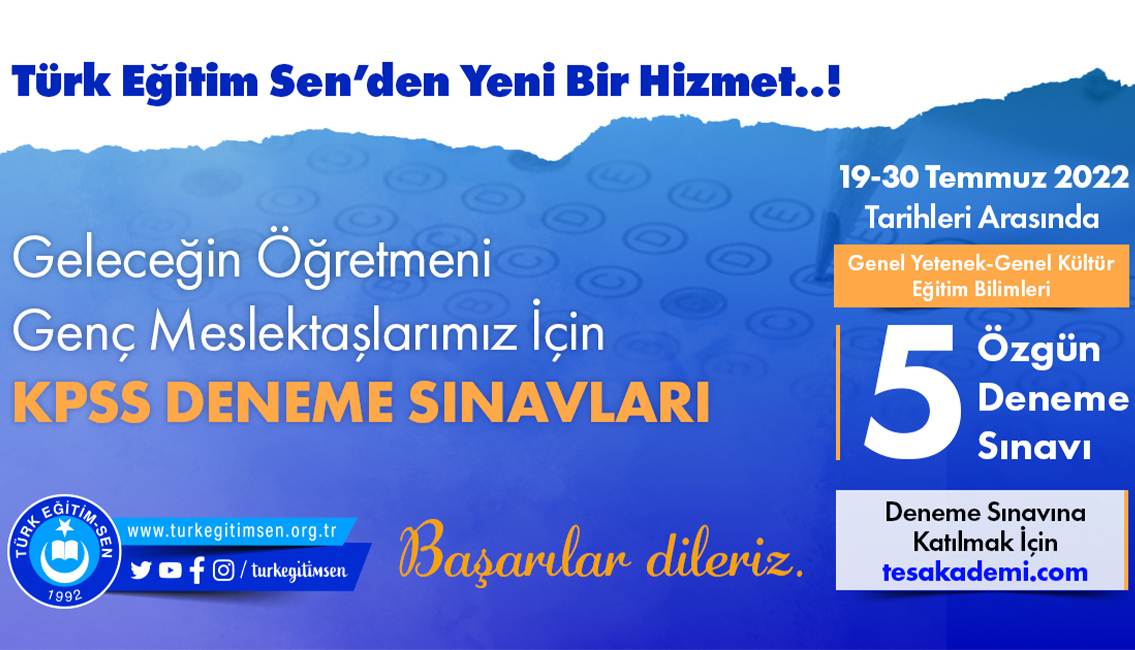Konuyla ilgili açıklama yapan Türk Eğitim-Sen Genel Başkanı Talip Geylan, sendikamızın www.tesakademi.com adlı online bir eğitim platformu kurarak üyelerimize yönelik sınavlara hazırlık eğitimleri, elektronik kitap desteği ve deneme sınavları hazırladığını hatırlatarak, bu kapsamda genç meslektaşlarımızın talebi üzerine Türk Eğitim-Sen’in KPSS hazırlık sürecinde öğretmen adaylarına deneme sınavları hizmeti vermeye karar verdiğini söyledi.