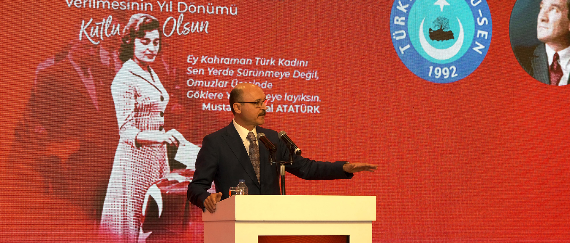 Daha sonra kürsüye gelen Genel Başkanımız Talip Geylan, Türk Kadınına Seçme ve Seçilme hakkının verilişinin 90. yıl dönümü kutladı. Geylan, “5 Aralık 1934’te Anayasa değişikliği yapılarak, Türk kadınlarına milletvekili seçme ve seçilme hakkı verildi. Bu hakka kadınlar, Fransa’da 1944’te, İtalya’da 1945’te, Yunanistan’da 1952’de, Belçika’da 1960’ta, İsviçre’de 1974’te sahip olurken, Büyük Atatürk kadınlarımıza bu ülkelerden çok daha önce seçme ve seçilme hakkı verdi.Atatürk,çağlar ötesini görebilen büyük bir lider idi. Öngörüye bakar mısınız? Atatürk, son çağda yüce rabbimizin Türk milletine bir hediyesi, bir lütfudur. Bir kez daha Büyük Atatürk’ü rahmet, minnet ve Fatiha’larla anıyoruz.” şeklinde konuştu.