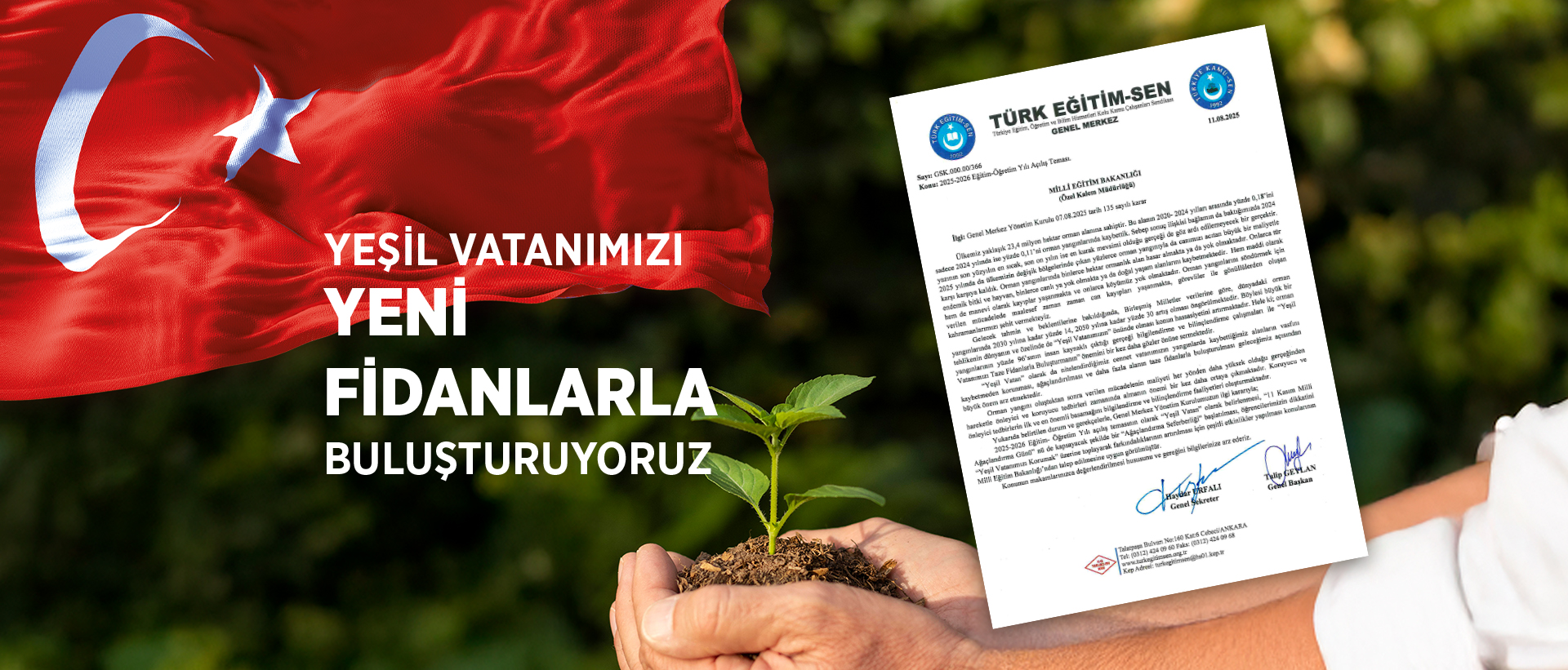Ayrıca Türk Eğitim Sen olarak Türkiye genelinde “Yeşil Vatanımızı Yeni Fidanlarla Buluşturuyoruz” konulu Ağaçlandırma Seferberliği başlatacağımızı da bu vesileyle duyuruyoruz. Buna göre; şubelerimiz aracılığıyla dikilecek fidanlarımız hem yurdumuzun ağaçlandırmasına katkı sağlayacak hem de çevre farkındalığını artıracaktır.